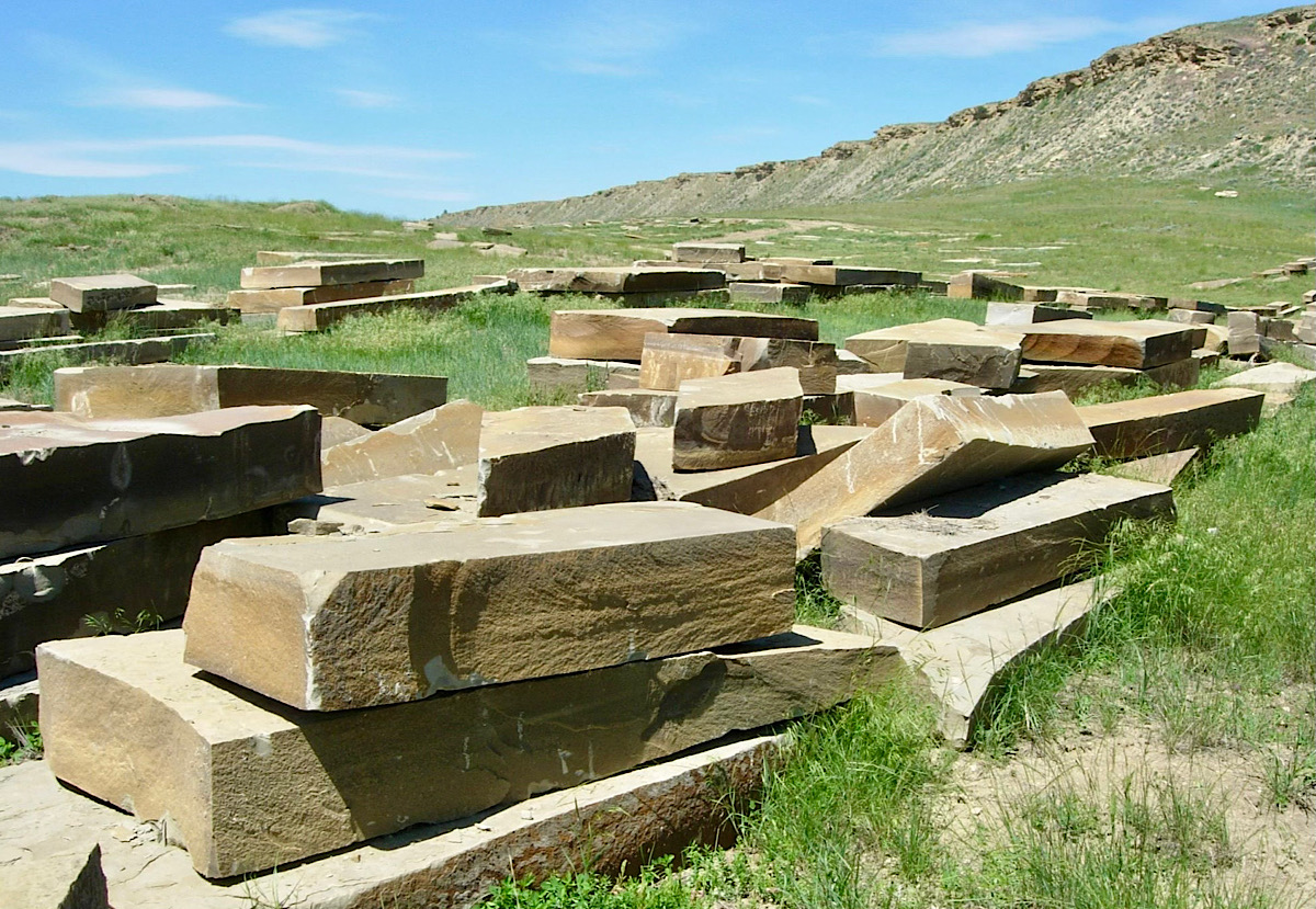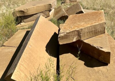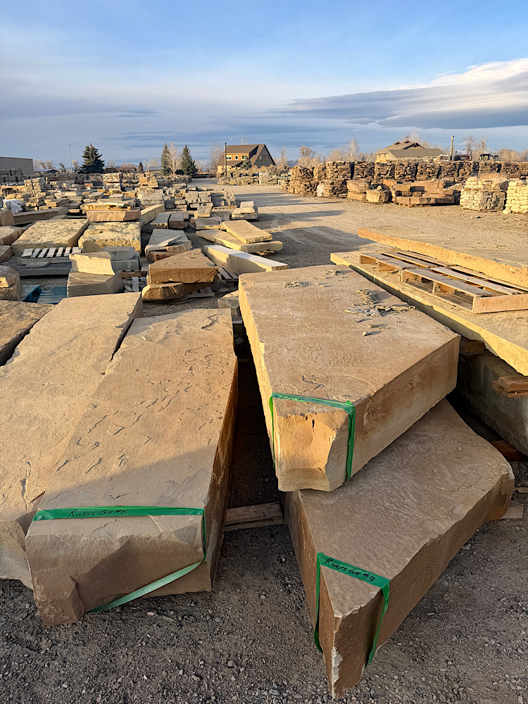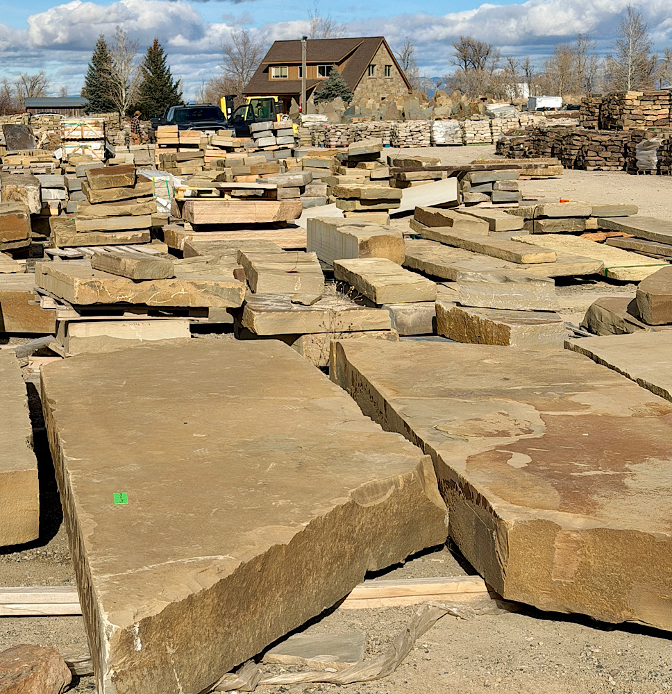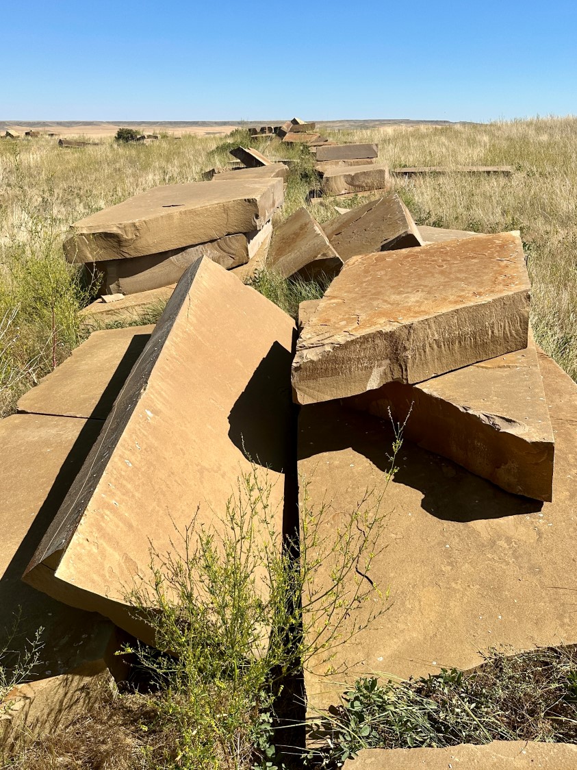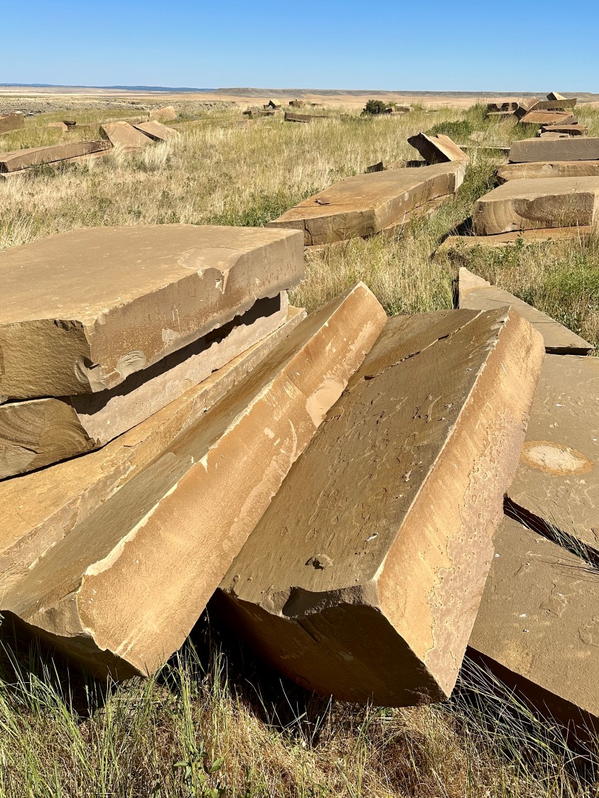 Frontier Sandstone Slabs ; We quarried these 10”-12”-thick sandstone slabs around 2003. They’ve sat on this central Montana ranch ever since. Last year we shipped all the best pieces (many truckloads) to our stoneyard 160 miles away. Now they are almost all gone. back to home page