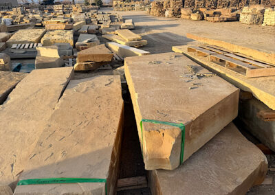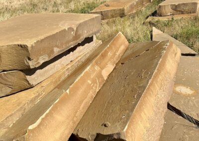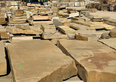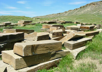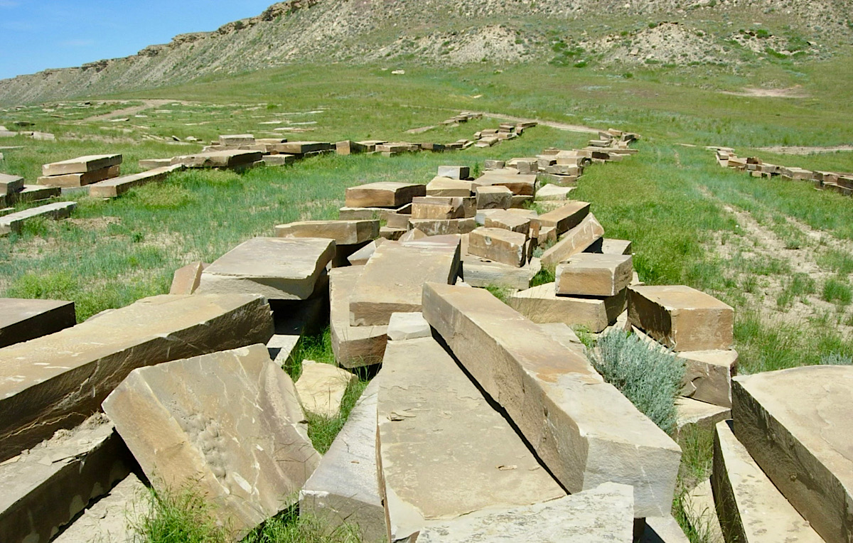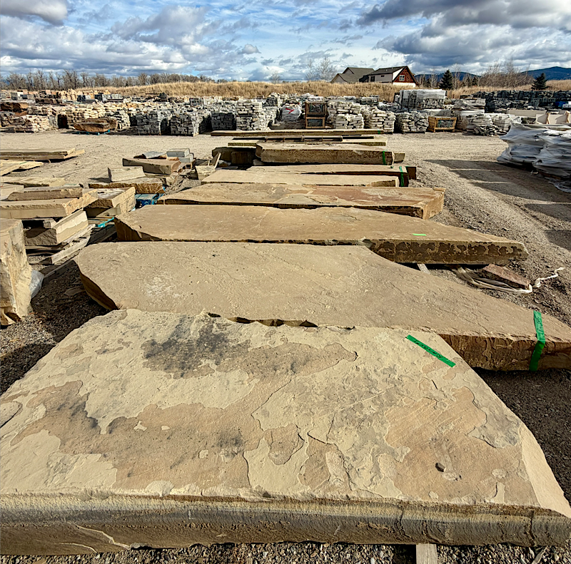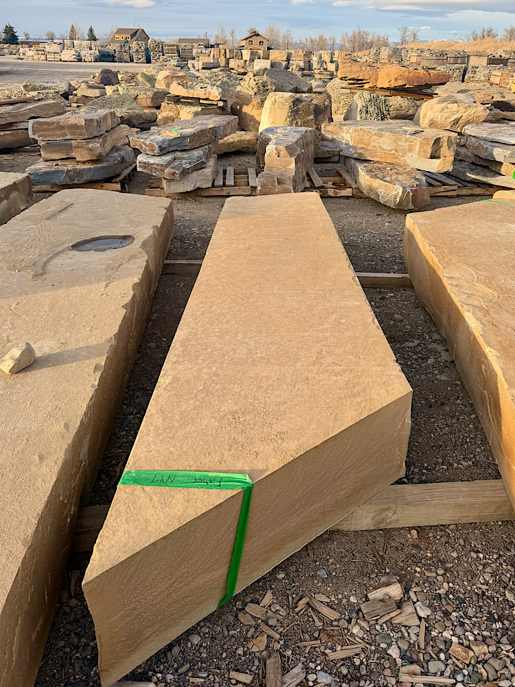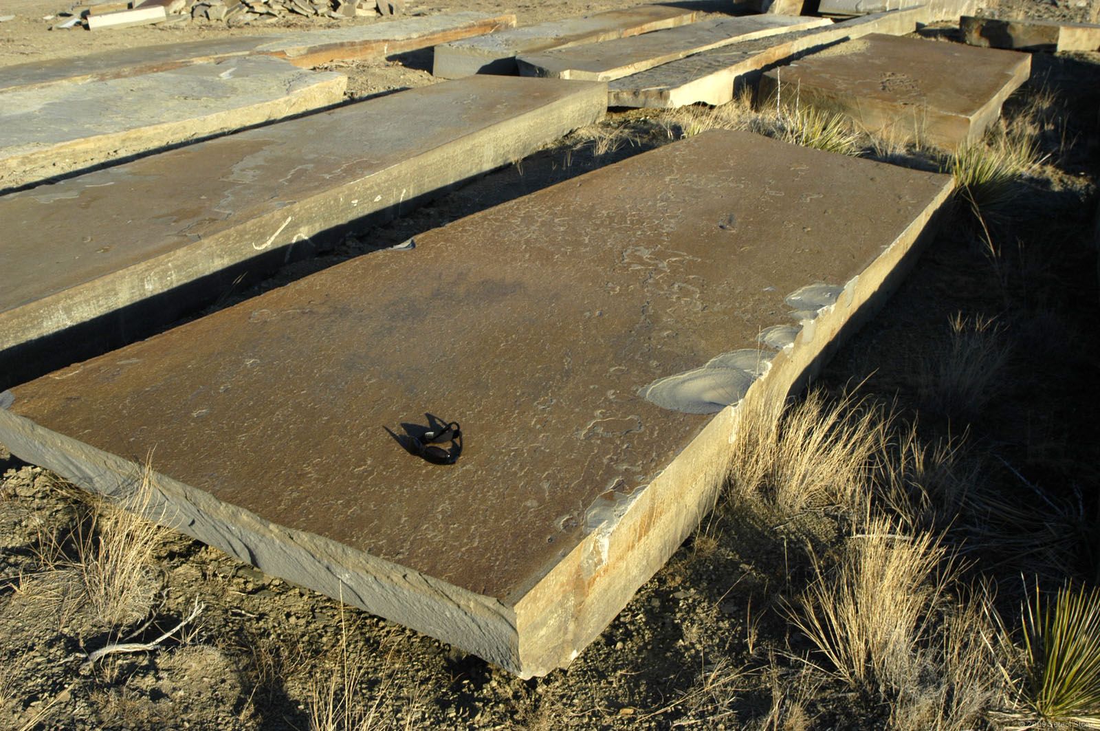 Frontier Sandstone Slabs ; We quarried these 10”-12”-thick sandstone slabs around 2003. They’ve sat on this central Montana ranch ever since. Last year we shipped all the best pieces (many truckloads) to our stoneyard 160 miles away. Now they are almost all gone. back to home page